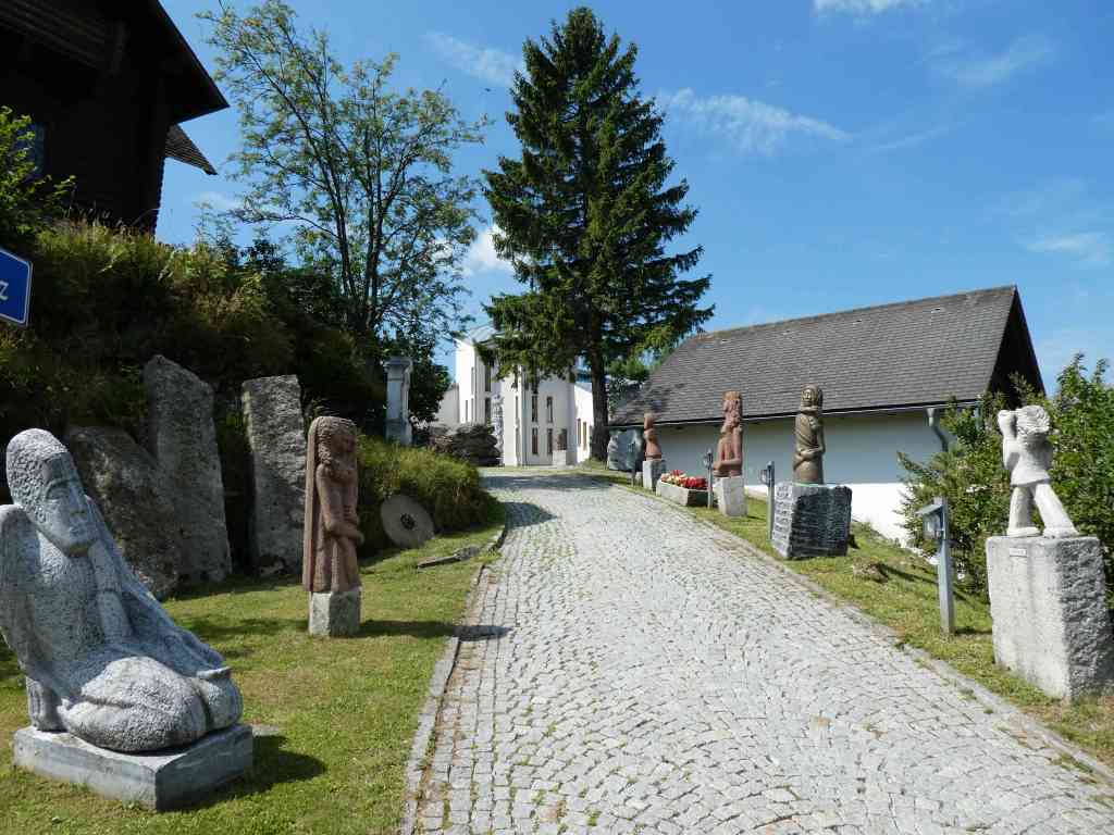 Wir parken in Bad Traunstein unseren Pkw bei den Stellplätzen im Nahbereich der Pfarrkirche St. Georg. Eine mit Skulpturen gesäumte Zufahrt macht uns neugierig …