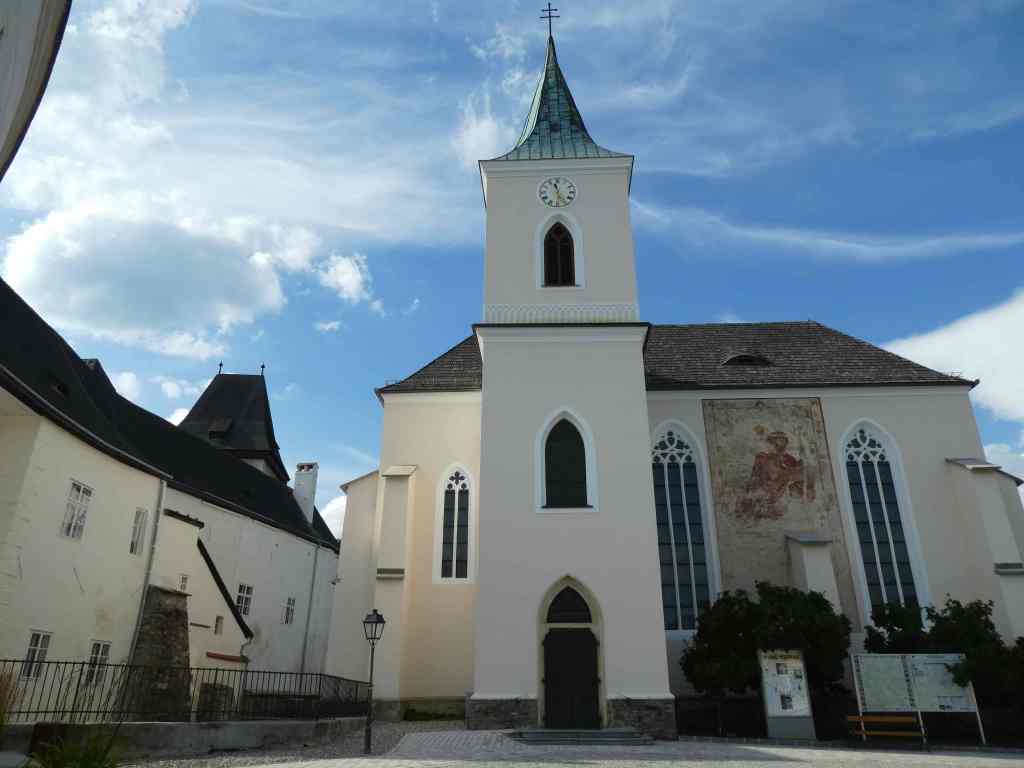 Wir gehen links herum und gelangen gleich ins Innere des Sakralbaus, der nur Samstag, Sonntag und Feiertag geöffnet ist. Der Chor birgt einen dreiteiligen neugotischen Hochaltar mit vergoldeten spätgotischen Relieffiguren von fünf heiligen Frauengestalten von ca. 1480. An der Nordwand erkennt man Freskenreste mit Szenen aus der Leidensgeschichte Jesu.