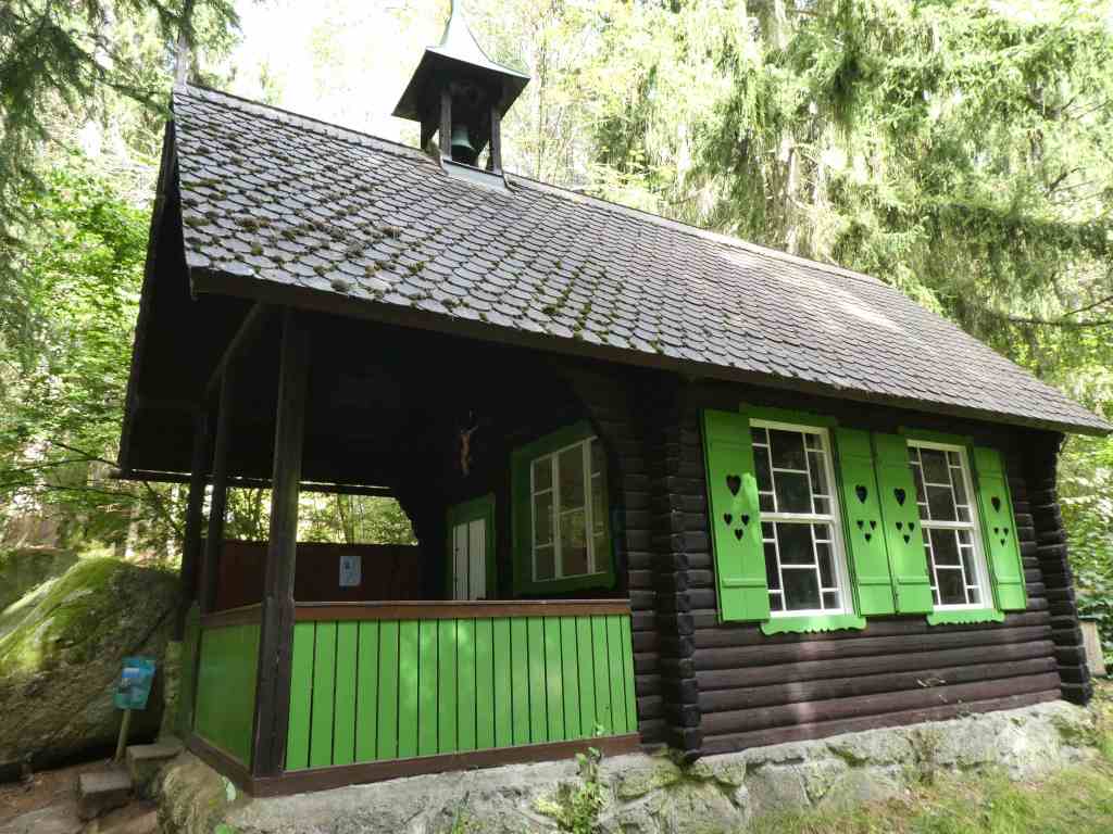Unvermittelt – 5,8 km nach dem Opferstein – stehen wir vor einem weiteren Objekt der erwähnten Kraftarena: Es ist die Klauskapelle, ein schlichter Holzbau in Form einer Unterstandshütte mit einem Glockentürmchen, das eine besondere Funktion erfüllt.