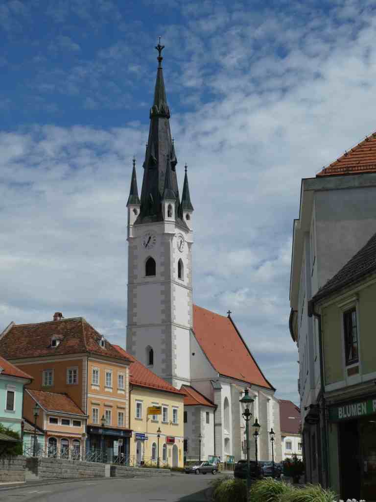 Dominierendes Bauwerk zwischen Hauptplatz und Kirchenplatz ist die während der Reformation 1593–97 entstandene Georgskirche. Der spitze Turm überrascht mit seinen vier kleineren Ecktürmchen, da er nach einem Brand 1880 der Prager Teynkirche nachempfunden wurde. Im Inneren fällt der Blick auf den Hauptaltar von 1730, wo der heilige Georg dargestellt ist. Am rechten Seitenaltar prangt ein Gemälde der schwarzen Madonna von Krakau, das ebenso vom „Kremser Schmidt“ gestaltet wurde. Im Gewölbe des Hauptschiffs findet man Stadtwappen, Doppeladler und Wappen der Familien Puchheim und Hoffmann.