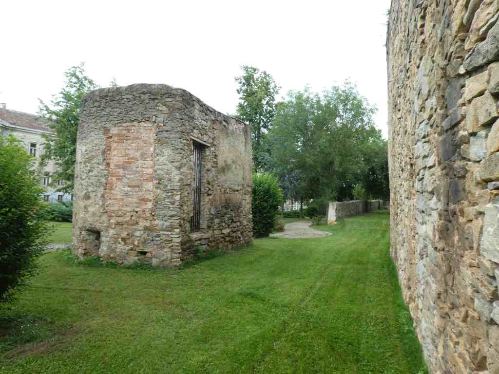 Auf dem Kirchenplatz beachten wir noch das Sgraffitohaus von 1587 (letztes Bild ganz unten), das 1767 bis 1850 als Rathaus diente und seither Bezirksgericht ist, spazieren durch die Pfarrgasse zur Thurnhofgasse, wo wir in einem schmalen Durchgang fortsetzen, um zu den nördlichen Stadtmauerteilen zu gelangen. So erreichen wir das Rondell, das als Bauelement der Zwingermauer eingegliedert war.