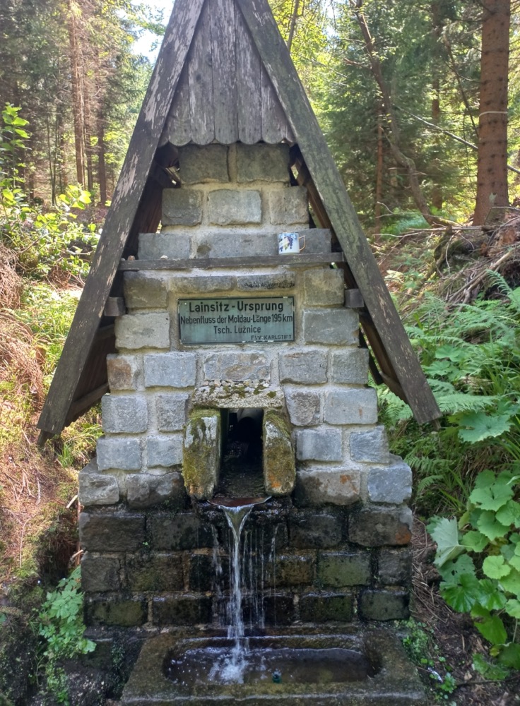 Nach etwa zwei Stunden Gesamtgehzeit erreichen wir auf dieser Wanderung auch die Quelle der Lainsitz, der in unserem Buch (unter „Am Wege“) ein längerer Absatz gewidmet ist und wo uns ein nettes Häferl dazu einlädt, das frische und saubere Wasser dieses hier ganz jungen Flusses zu verkosten.