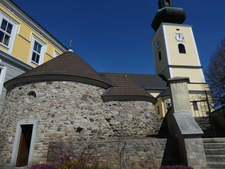 Nach dem Ortsende ist die Trasse der ehemaligen Thayatalbahn zu überqueren, die als Radweg gestaltet wurde. Über freies Gelände erreichen wir die Marktgemeinde Thaya mit ihrer Pfarrkirche und der Karnerkapelle.