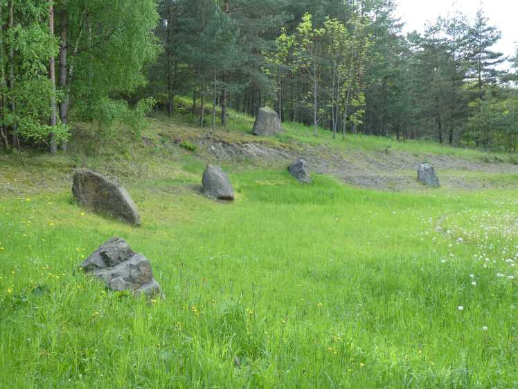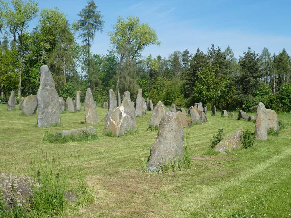 Es handelt sich um die Skulpturengruppe „Große Basilika“, eine Gruppierung von 97 Dioritfindlingen, die der Bildhauer Franz Xaver Ölzant hier in bogenförmigen Bahnen platziert hat, um die Mehrschiffigkeit von Sakralbauten zu symbolisieren.