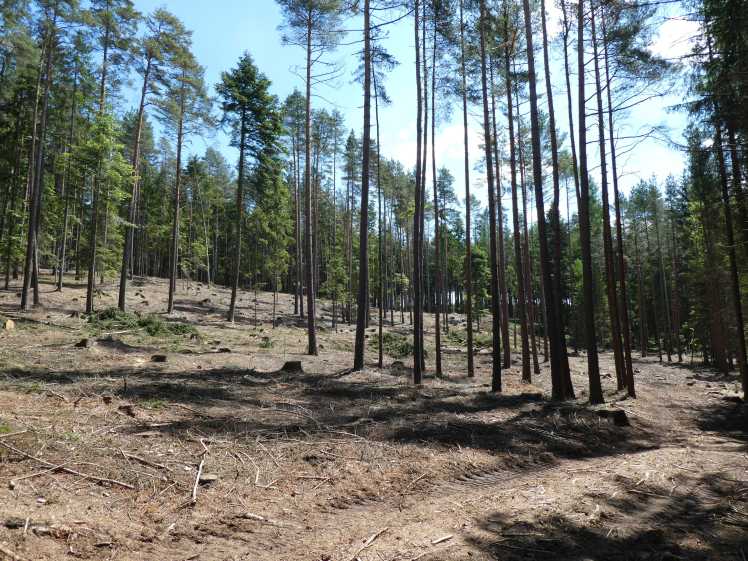 Wir verlassen den Ort Richtung Dobersberg, indem wir uns an der Straße (B 36) orientieren. In einer Senke überqueren wir zum dritten Mal die Thaya und wechseln die Straßenseite bei einer Birkengruppe. So steuern wir Niederedlitz an, das wir durchmessen und bergwärts verlassen. Im folgenden Rehbergwald sind Wanderer wieder mehr geschützt, wenn der Wald – wie in diesem Gebiet sehr häufig – nicht gerade durch Abholzungen reduziert ist …