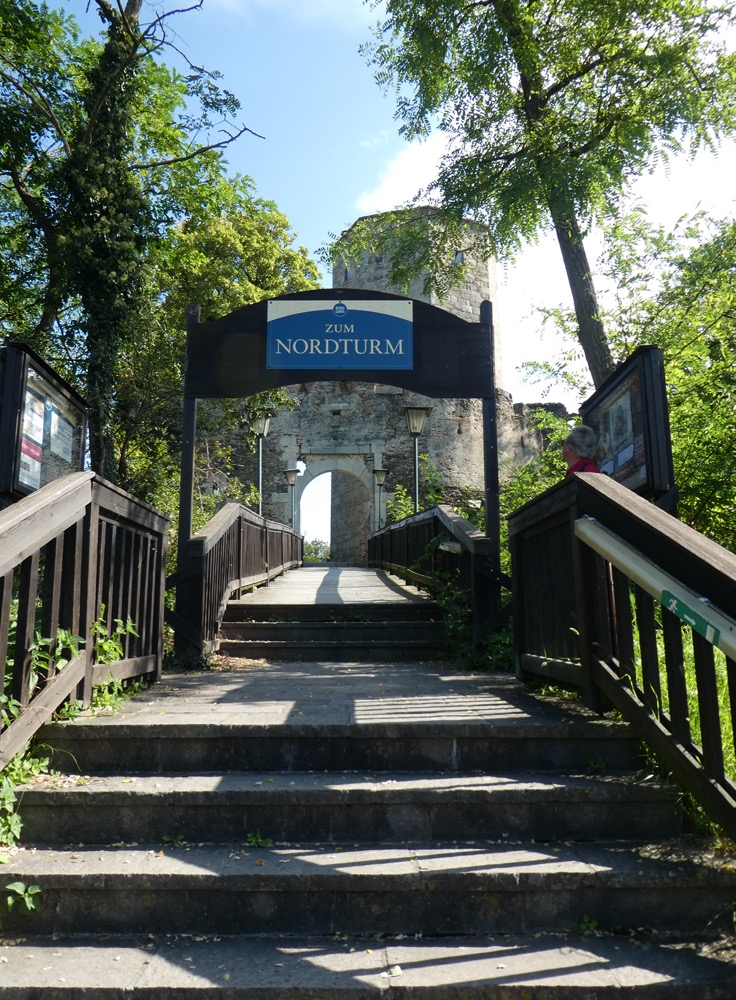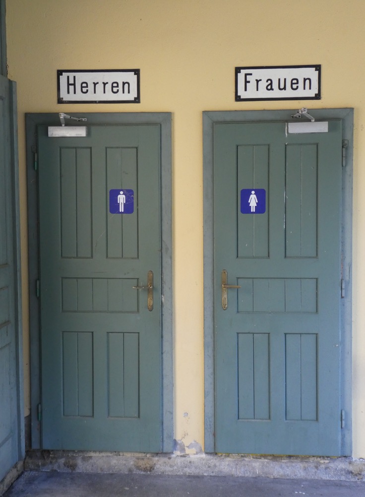 … an dem sich über den Klotüren noch zwei erfreulich altmodische Aufschriften fanden (siehe unten): „Herren“ und „Frauen“ – nicht „Herren und Damen“, wie das vielleicht einst in der Großstadt üblich war, auch nicht „Männer und Frauen (und Unentschiedene)“, wie man das heute in der Großstadt macht, nein: „Herren“ und „Frauen“. Denken Sie sich Ihren Teil und gehen Sie, wenn Sie noch müssen. Und dann bewundern Sie auf den ersten Metern der Tour das leider längst aufgelassene alte Kurhotel, über dem die noch älteren Ruinen der Burg aufragen.