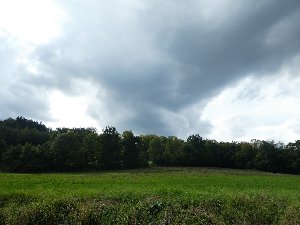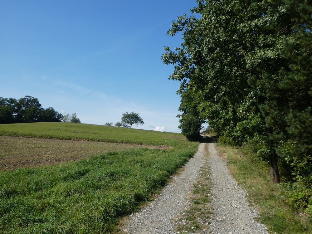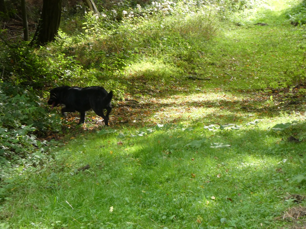 Wir gingen also weiter, auf das Ortsendeschild zu. Kurz davor stand eine ältere Dame in einem Gärtlein neben der Straße, riss Unkraut aus oder setzte es ein, wir wissen es nicht, warf uns aber auf jeden Fall und sicherheitshalber misstrauische Blicke zu. „Der gehört nicht uns“, fühlten wir uns bemüßigt zu sagen, was das Misstrauen eindeutig noch verstärkte, während der Hund freudig schwanzwedelnd vor uns dahinlief.