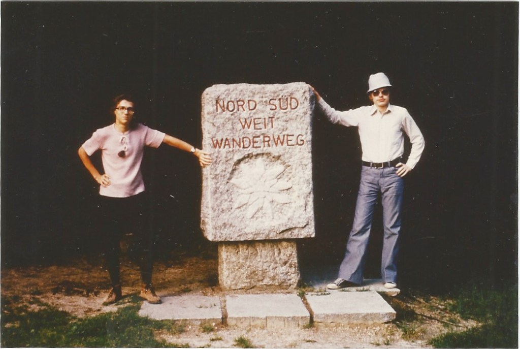 Das Ergebnis unserer gemeinsamen und oft sehr verschwitzten Bemühungen können Sie also jetzt in Buchform erwerben – und sehen es ab sofort auch auf dieser Website. Hier zeigen wir Ihnen aber auch noch, was im Buch nicht vorkommt, nämlich eine historische Aufnahme aus dem Jahr 1975, als die Herren Singer (links im Bild, fast dasselbe Leiberl …) und Hiess (rechts im Bild, halb so viele Kilos) sich in jungen Jahren daranmachten, den Nord-Süd-Weitwanderweg vom Nebelstein (natürlich im Waldviertel) bis Eibiswald in der Südsteiermark zu beschreiten. Weiter als bis Melk sind wir eh nicht gekommen.